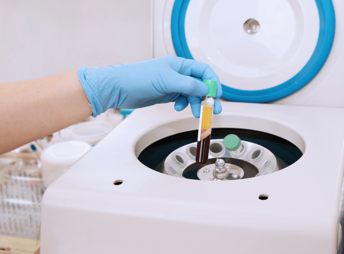 A small blood sample is taken and processed to isolate the platelet-rich plasma.